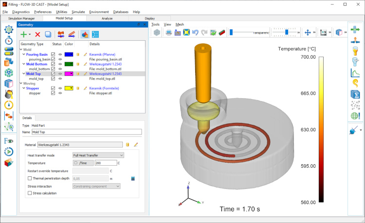 Die einzigartige Möglichkkeit der Modellierung von bewegten Objekten bietet dem Anwender zudem zahlreiche weiterführende Untersuchungsmöglichkeiten (zum Beispiel Modellierung des Injektorcastings, Schmelzebehandlung und -transport, Befüllung des Tümpels, ...). In umfangreichen Datenbanken sind eine Vielzahl an Material- und Stoffdaten hinterlegt. Dies erlaubt eine extrem schnelle, automatisierte und zugleich intuitive Modellierung der einzelnen Prozesschritte.